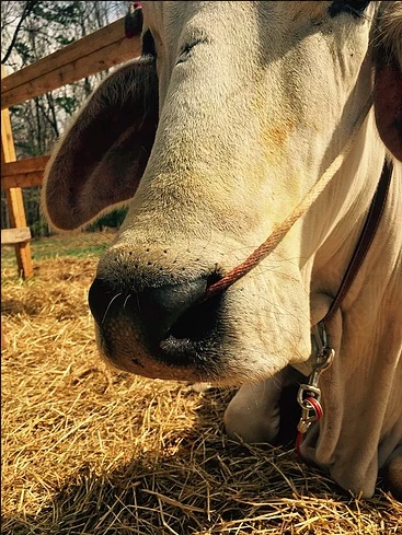 The Plow & Flute, a “vedic eco-farm” and homesteading project that was coming together outside of Asheville, NC, is an example of the kinds of abuse even self-professed animal lovers will inflict on animals they see as resources to be exploited. In a blog post about piercing the noses of the mother cow that used to live on their property, Svati, whom they use for dairy, and her calf, they state that piercing the animals’ noses was necessary in order to be able to better control them, especially the calf, Sanatana, whom they wanted to prevent from nursing so they could take his milk for themselves. The horrific pain and violence inflicted on these animals in order to pierce their noses would land its perpetrators in jail if it were done to dogs or cats. The following photos and text are from their website: